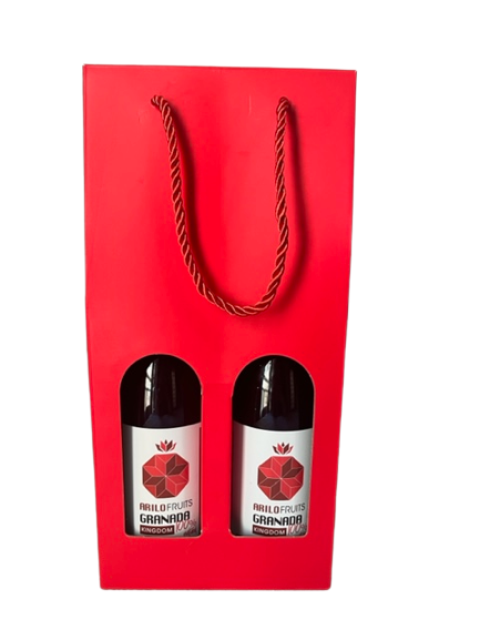 Si quieres sorprender a tus amigos y familiares con unas botellas de zumo de granada natural, te ofrecemos el formato ideal para regalar. Caja de dos botellas de cartón de color rojo con asa para fácil transporte.